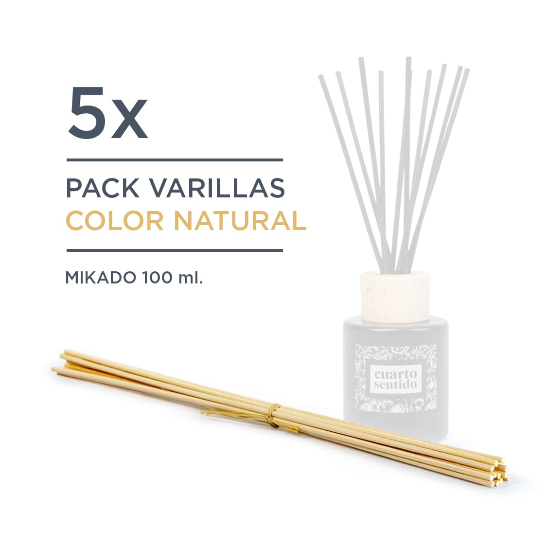 5 juegos de varillas de color madera natural para sustituir los sticks usados de tu mikado de 100 ml. Recuerda que es recomendable darles la vuelta a las varillas cada 15 días y sustituirlas cada 3 meses.